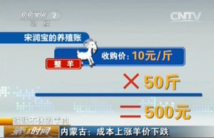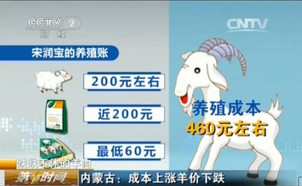 记者来到了我国羊肉产量最大的内蒙古自治区进行了调查,这里的牧农告诉记者,今年养殖羊的数量比去年增加了一倍,但收入却大大减少了。羊养殖户宋润宝告诉记者,如果玉米价格再飞涨,他养羊就连微利都保不了,明年就不准备再养羊了,不如改种玉米。