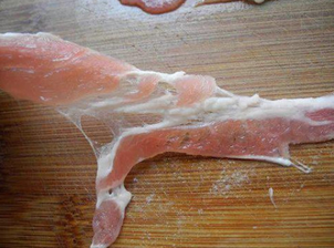 分辨假羊肉最好的方法就是,把羊肉片化冻。化冻后的假羊肉片立刻就显出了原形,我们看一下下面这张图,化冻后的假羊肉红肉和白肉轻轻一碰就分开了,一看就不是自然长成的肉。